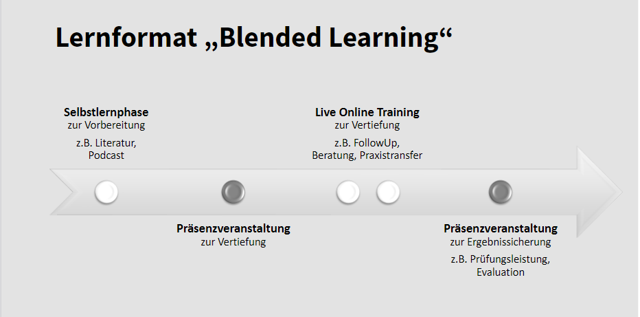 Zudem ermöglicht das Blended Learning durch die Nutzung digitaler Medien und den persönlichen Kontakt vor Ort mit unseren Dozenten und Dozentinnen die Flexibilisierung des Lernortes, sodass die Teilnahme zuverlässig und leicht mit den Anforderungen der Berufswelt vereinbar ist.
